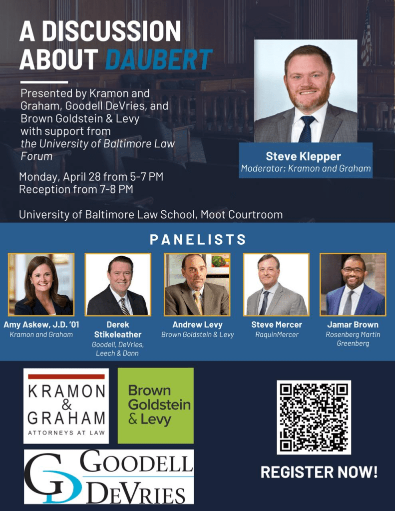 On Monday, April 28, at 5:00, the University of Baltimore Law Forum will host a panel discussion, sponsored by Kramon & Graham, P.A., Goodell DeVries, and Brown Goldstein & Levy, about the Daubert standard in Maryland.